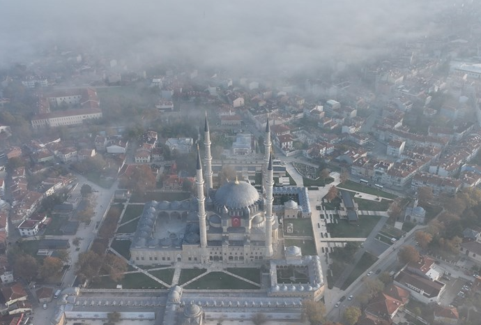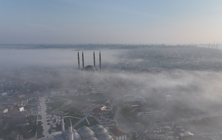 Edirne’de kent merkezinin yüksek kesimlerinde sabah saatlerinde sis bulutları görüldü. Görüş mesafesini etkilemeyen bu sis, Selimiye Camii’ni tamamen kaplayarak dikkat çekici görüntüler oluşturdu.