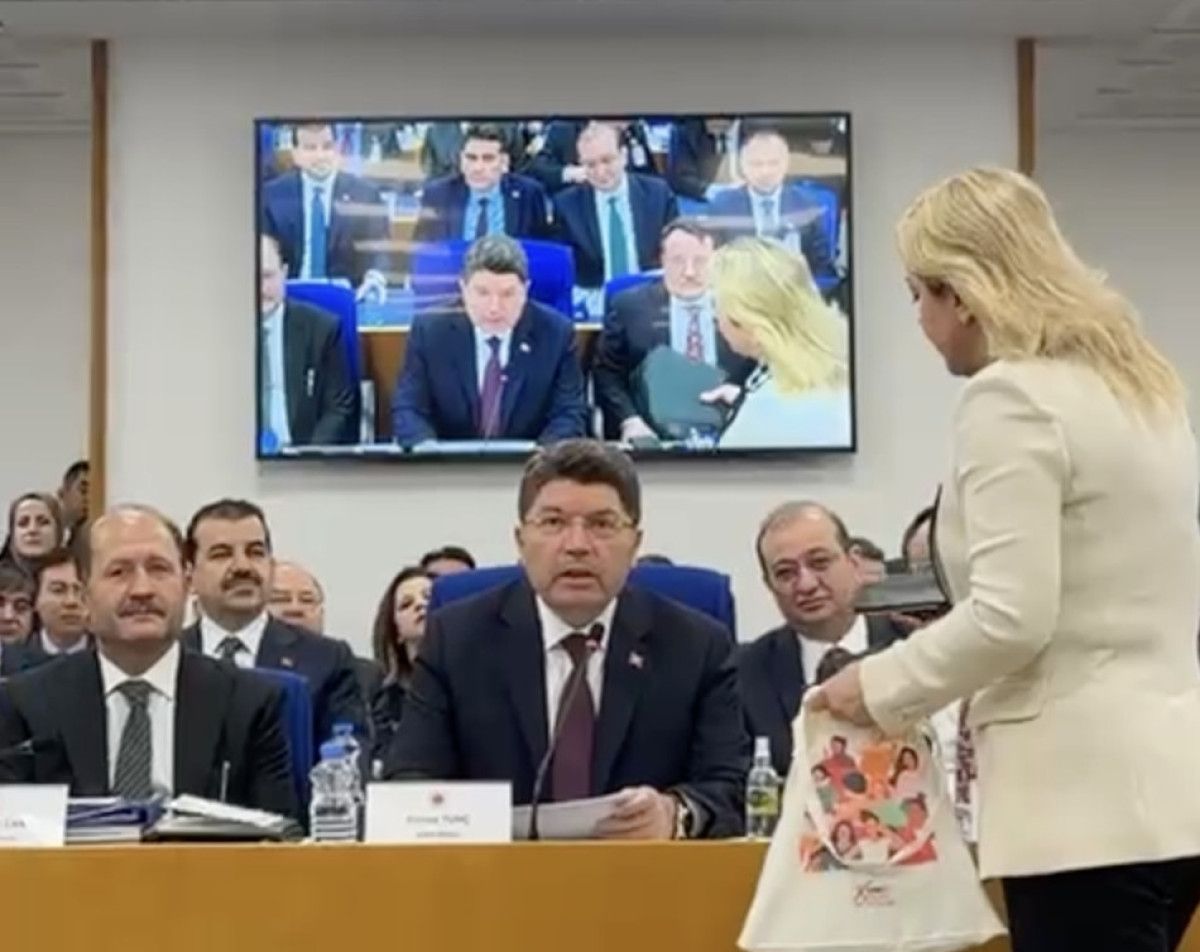 CHP’li Kaya, sunumun başladığı sırada usule aykırı şekilde Adalet Bakanı Tunç’un yanına giderek elindeki siyah zarfları bıraktı.